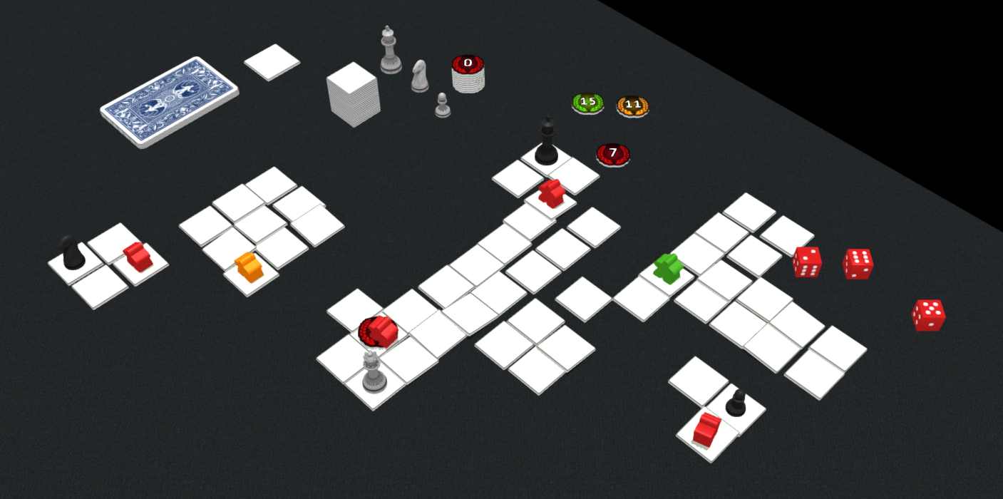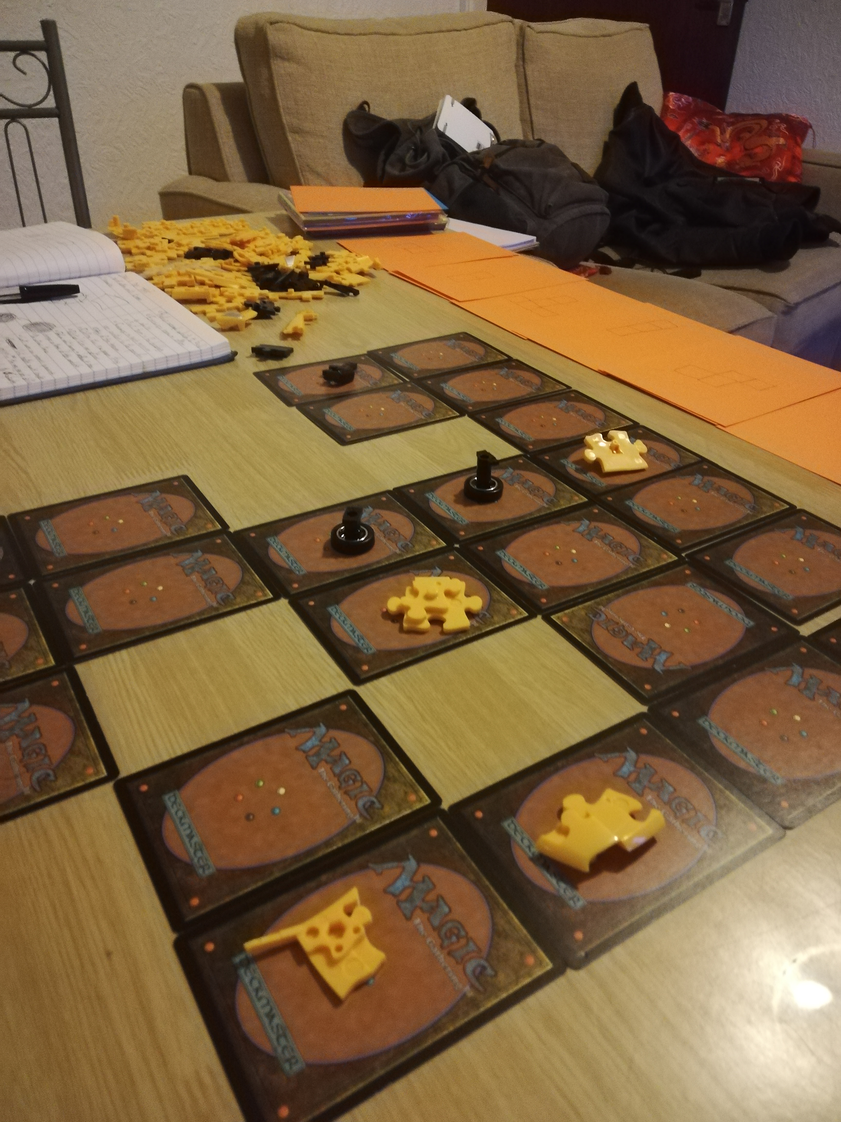 This allowed us to test more mechanics using dice, such as a simple combat system, drawing cards representing room shapes and lengths, movement mechanics and even tile deterioration mechanics.