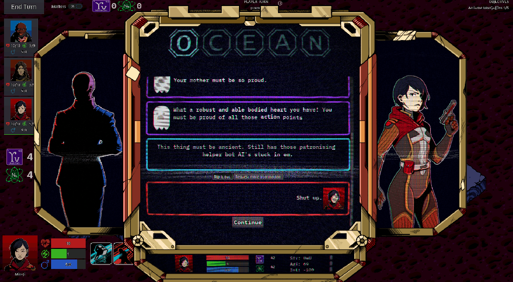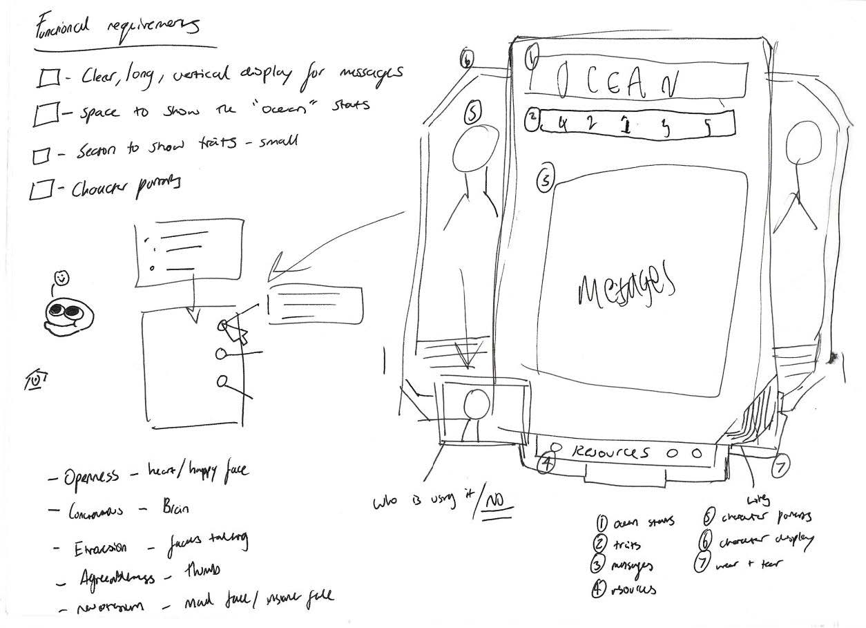 The primary components I needed to take into account with the communication of information was the OCEAN stats, in-game resources shown on the panel at the bottom as these played into the progression, and the main character panels.