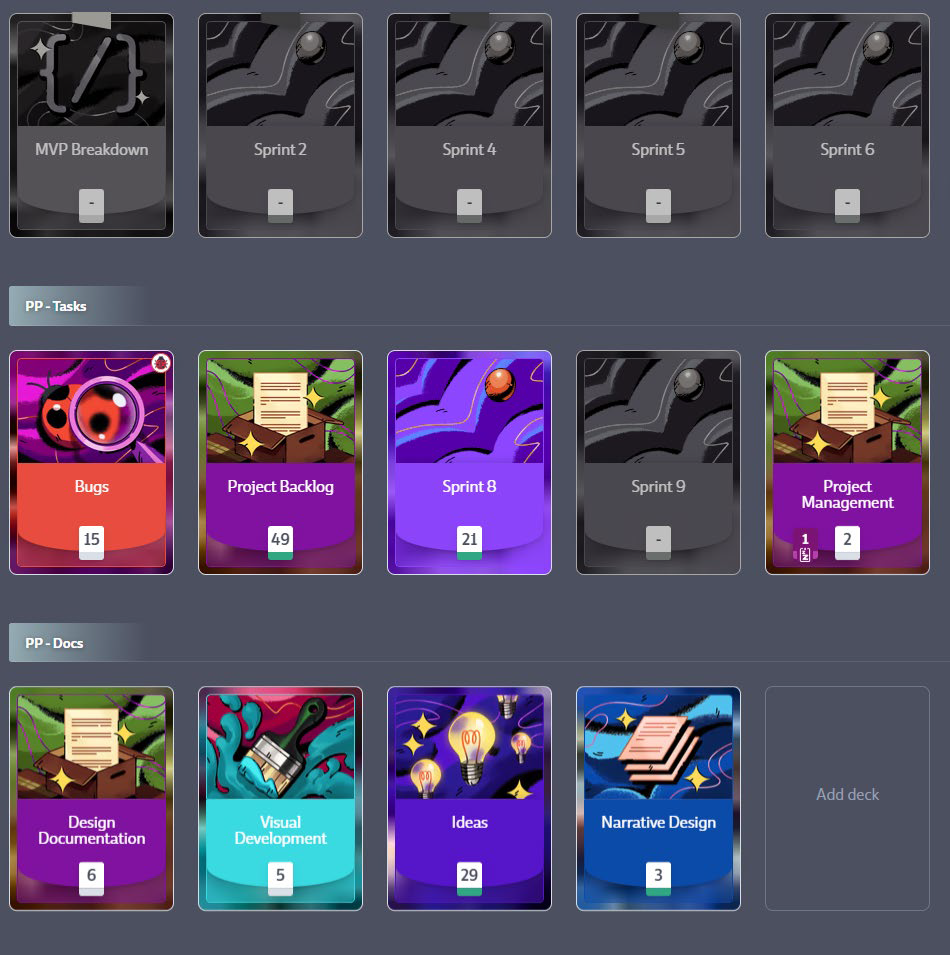 I setup a collaborative group work space on Codecks, tracking each feature as a deck of cards and the tasks required to complete the feature represented as individual cards comprising the respective decks. We used this to work towards MVP.