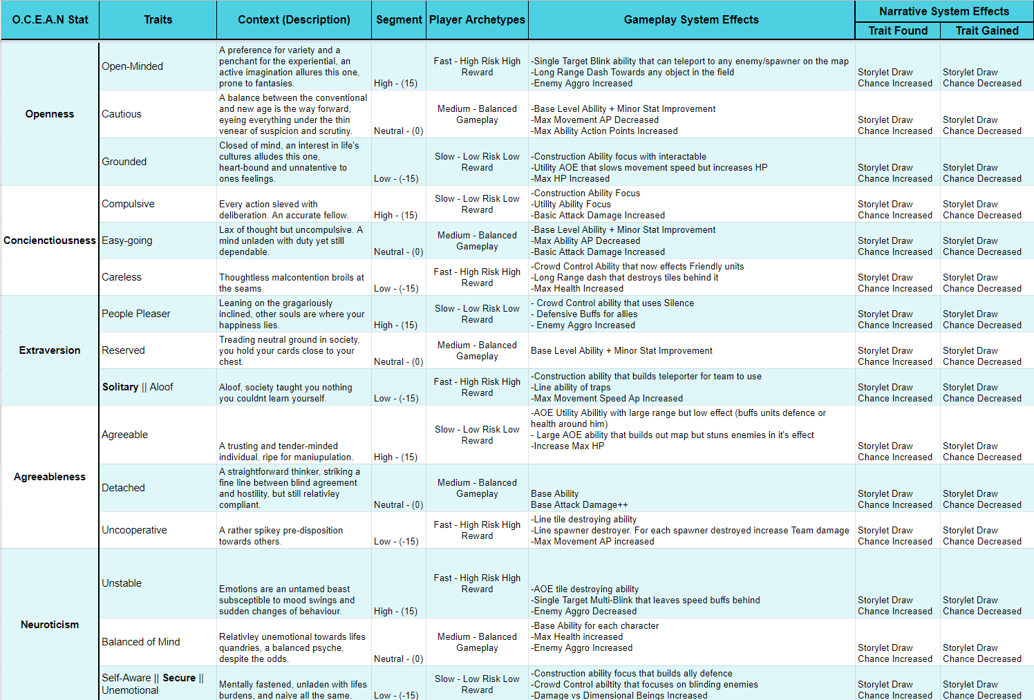 I extended the OCEAN stat system, creating 15 different traits (3 for each stat), allowing the player to get 1 trait for each stat on each character, providing the opportunity to get 5 traits per character that can help define their personality and affect the combat/building abilities.