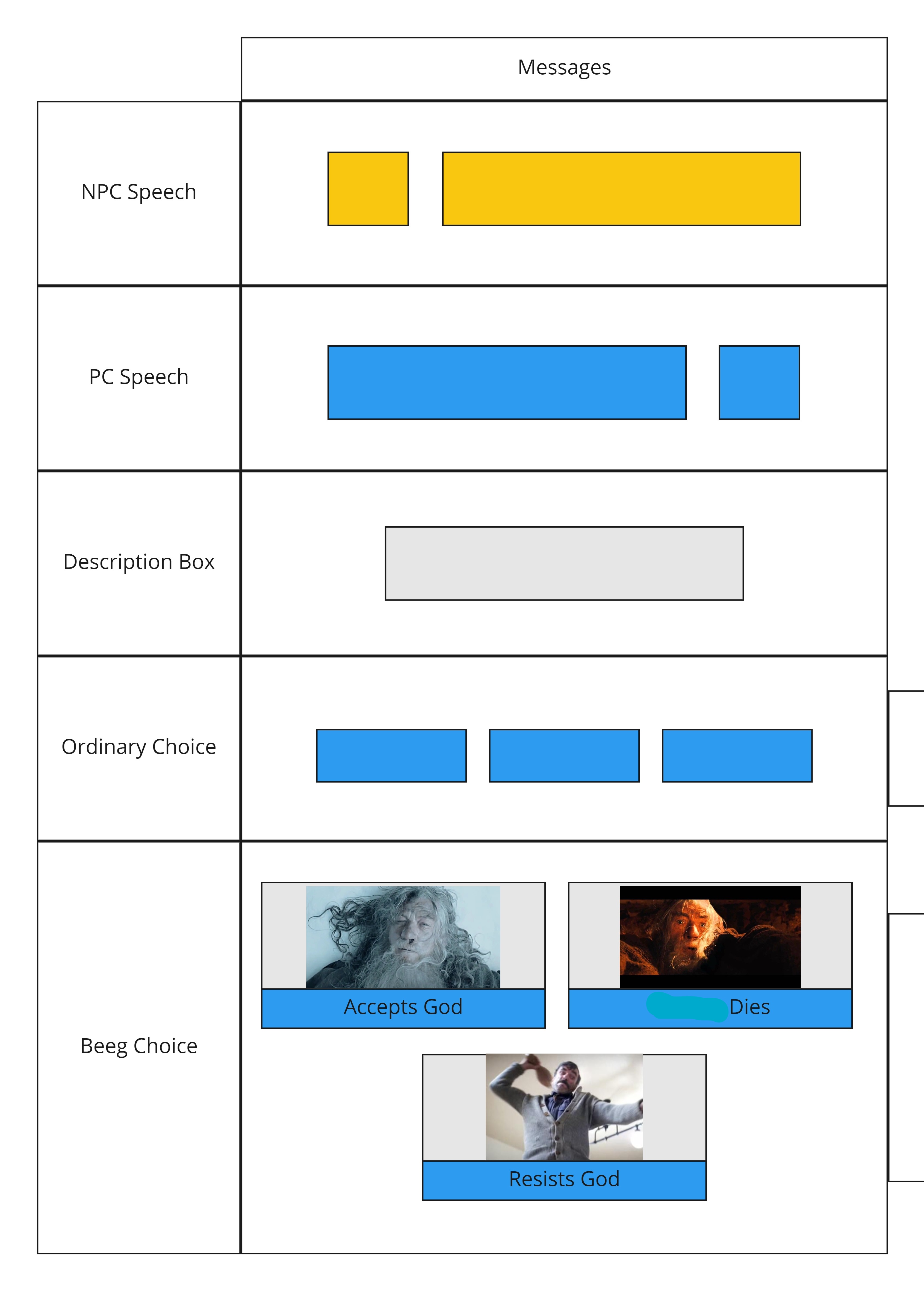 Before jumping back into engine I wanted to structure this out better to understand how the messaging system would work technically. So I flowcharted how the choices would work by deriving from a message, then assigning choices from the story to each button.
