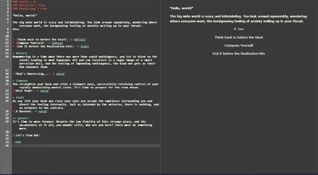 The programmer and I managed to correct this quickly, implementing a more robust text parser that could listen to the HTML Tags functionality in Ink, adding functionality for an Observer through a “Globals” file to store variable changes both in gameplay and in story, and even extended the core implementation of the plugin with functions that can apply affects to the game state from the story, and vice versa.