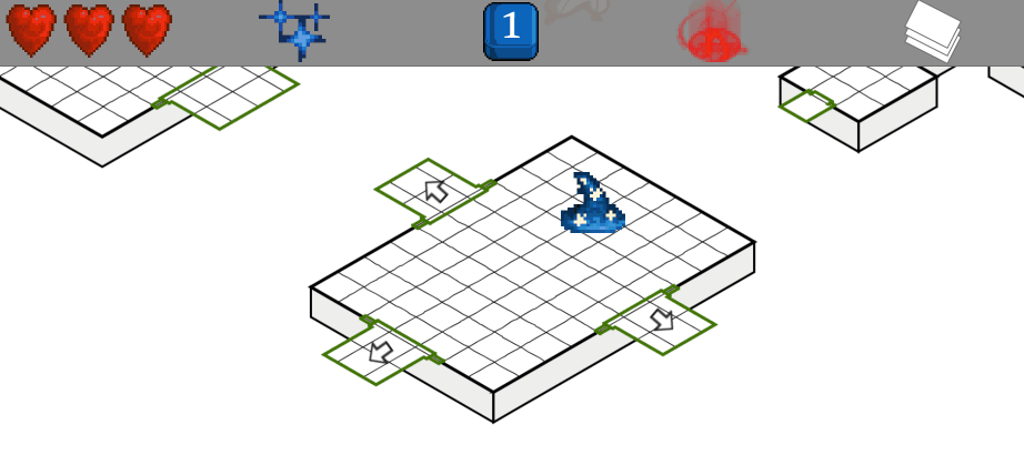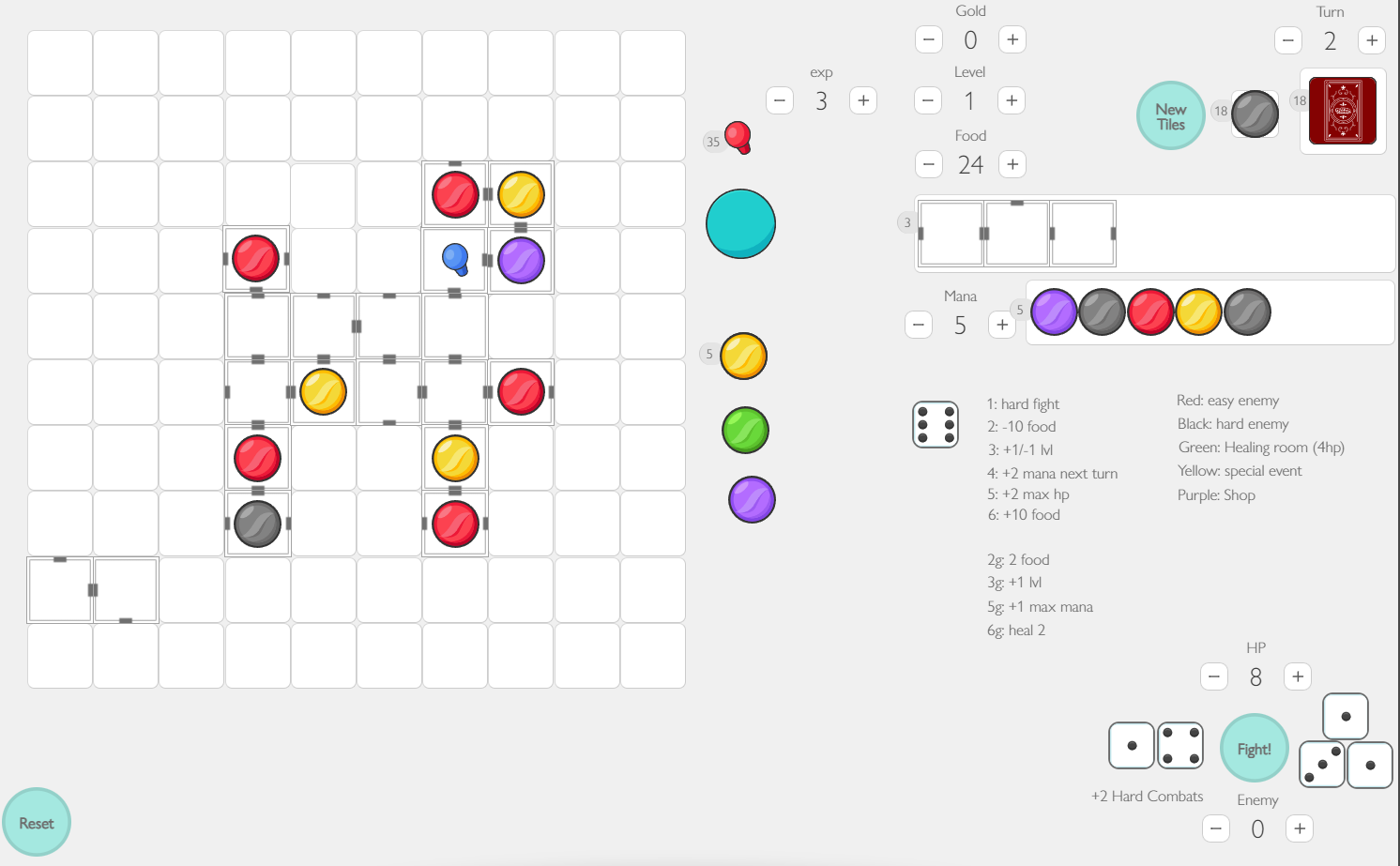 Using cards/tiles to represent rooms, and tokens on top to represent events or actions we experimented with mechanics like room adjacencies, doorways that funnel movement, healing and combat rooms etc. Everytime something didn’t work, we would iterate on the fly.