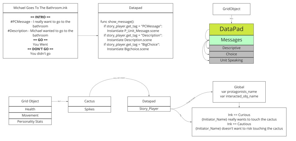 I threaded all of the game state user facing variables through Ink to be affected by the stories by writing the functions in Godot that would connect the gameplay and narrative systems together, acting as the go to point for all things narrative and progression.