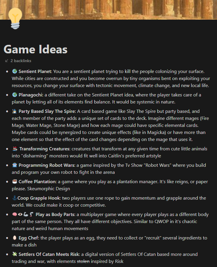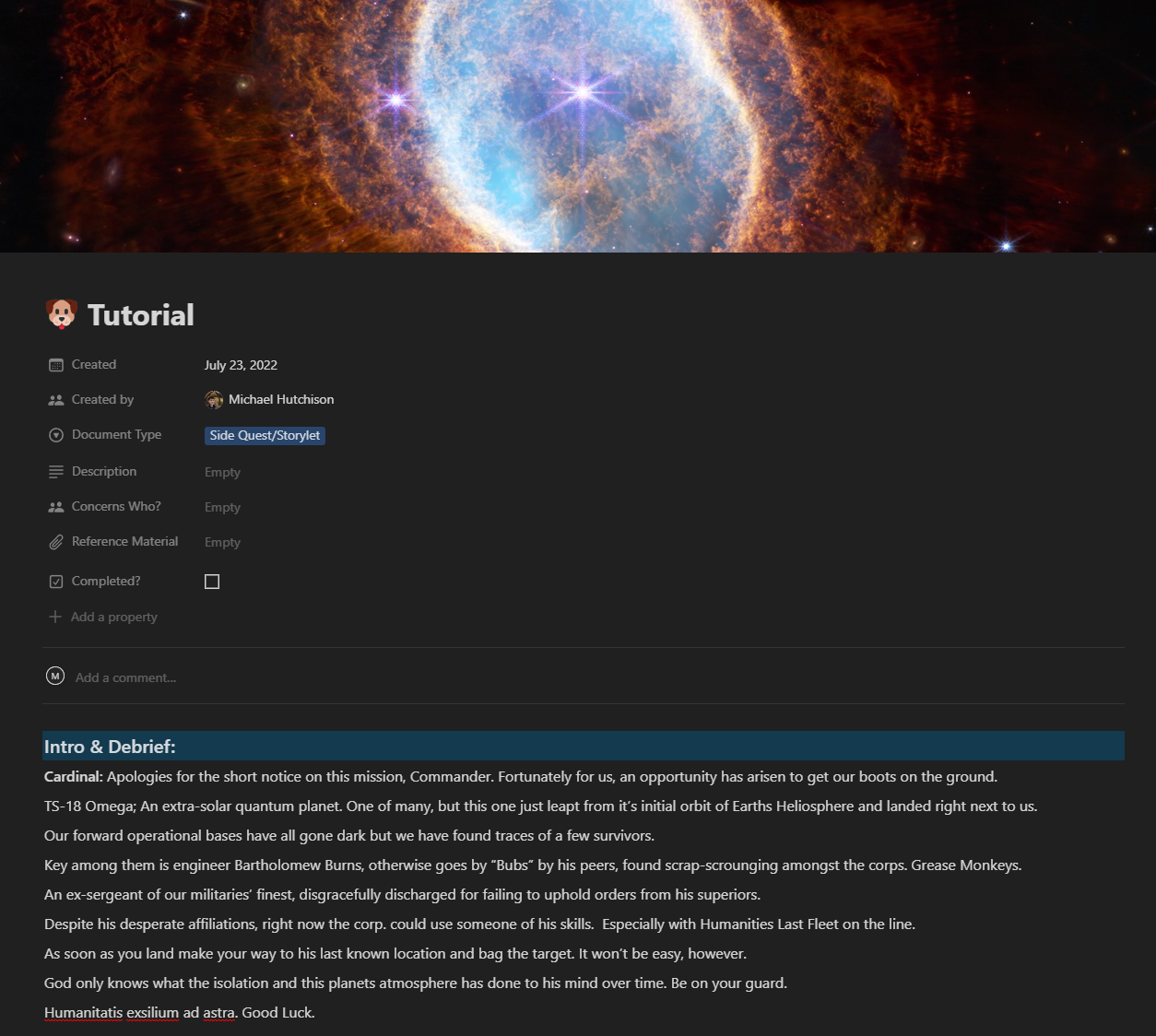 So I started doing research into world building and the narrative setting the game would play within, keeping a log of any narrative ideas pitched and accepted/rejected by the team.