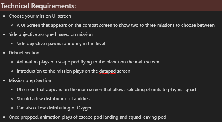 I pitched to the team some potential options, including utilising more embedded player characters, with defined backstories (Ala Darkest Dungeon 2) or embedded side characters, who’s missions/tasks would help shape the main characters through player decisions.