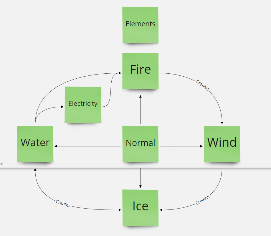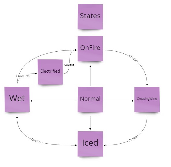 I was very inspired by Zelda: Breath of the Wild’s GDC talk about breaking conventions. In it, they discuss the concept of seeing game design as chemistry, similar to Daniel Cook, and they wanted to create a system of multiplicative gameplay that aimed to explore gameplay that was modeled after chemistry by having their physics engine focus on handeling collision and movement, and their “chemistry” engine would focus on the states of change that occurred from the physics based gameplay.