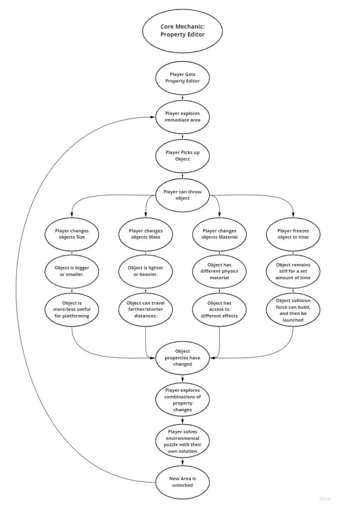 After some ideation I like to go a bit deeper and explore the ideas further through flowcharting a core game loop that could be created with the mechanic, to see if the idea has any legs, and then eventually flesh out the other system elements to start seeing how the property editor mechanic will work with other mechanics.