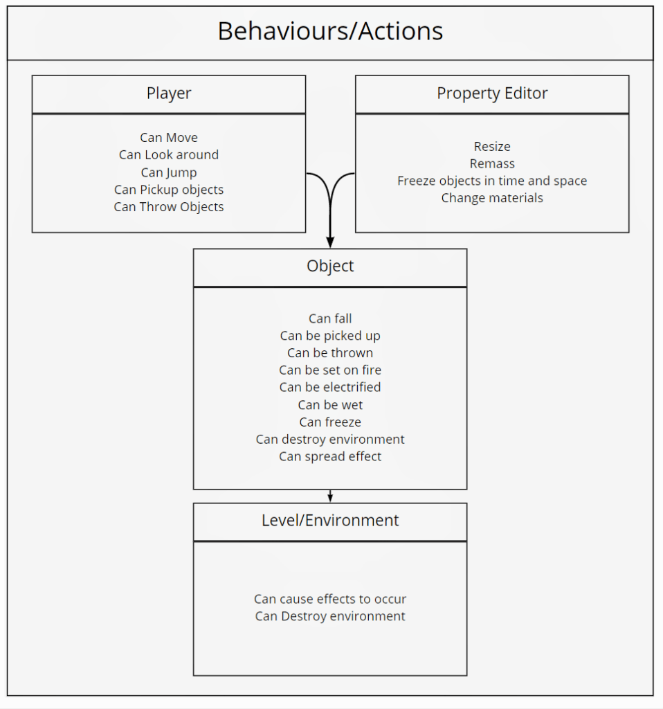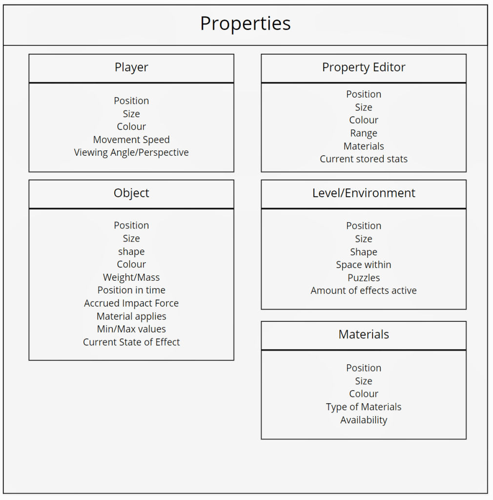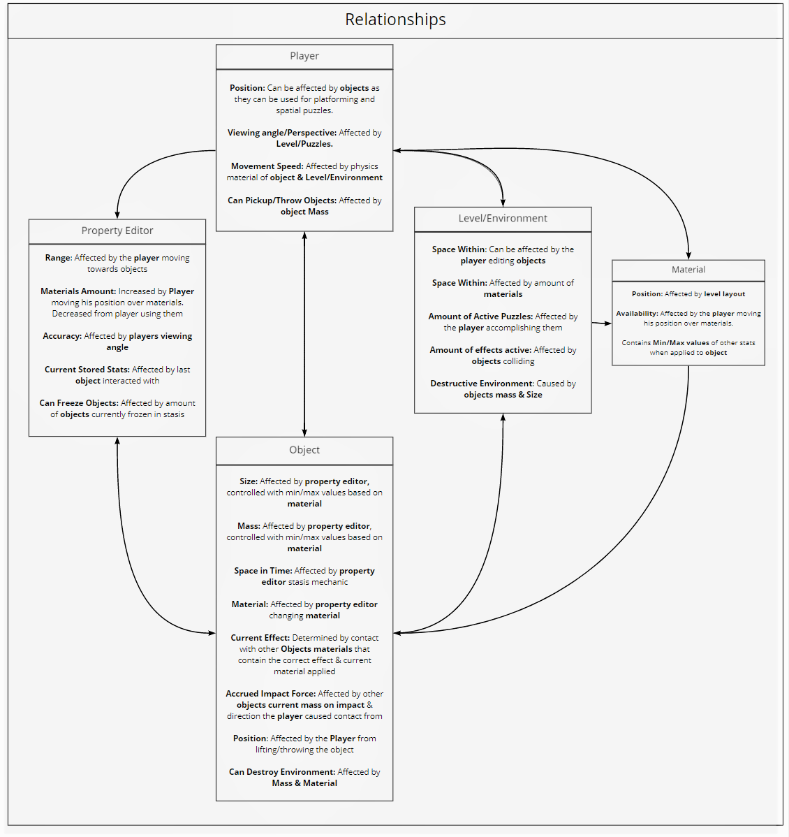 I wanted to explore this further through my prototyping, so I created a small system loop to visualise how the mechanic of editing properties could be expanded upon with several different properties to edit and how they would effect each other in regards to causing changes of states in the environment.