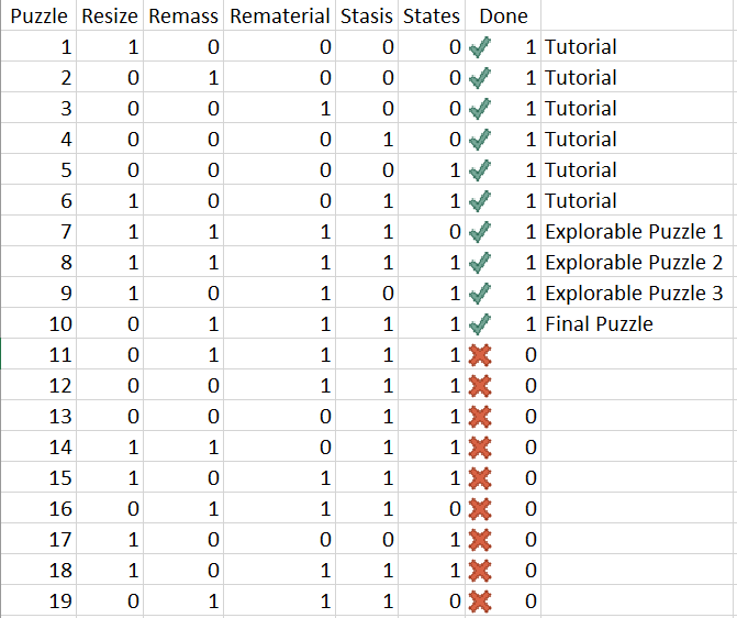 As I explored various ideas, I would document all of this information in both my blog and my mechanics supplementary design page “Property Editor” which details my thought process and design decisions informed by research. After I was confident enough to move forward on the idea with more direction to guide my digital prototyping, I made a small variety index to keep track of the combinations of the mechanics I was using in each puzzle.